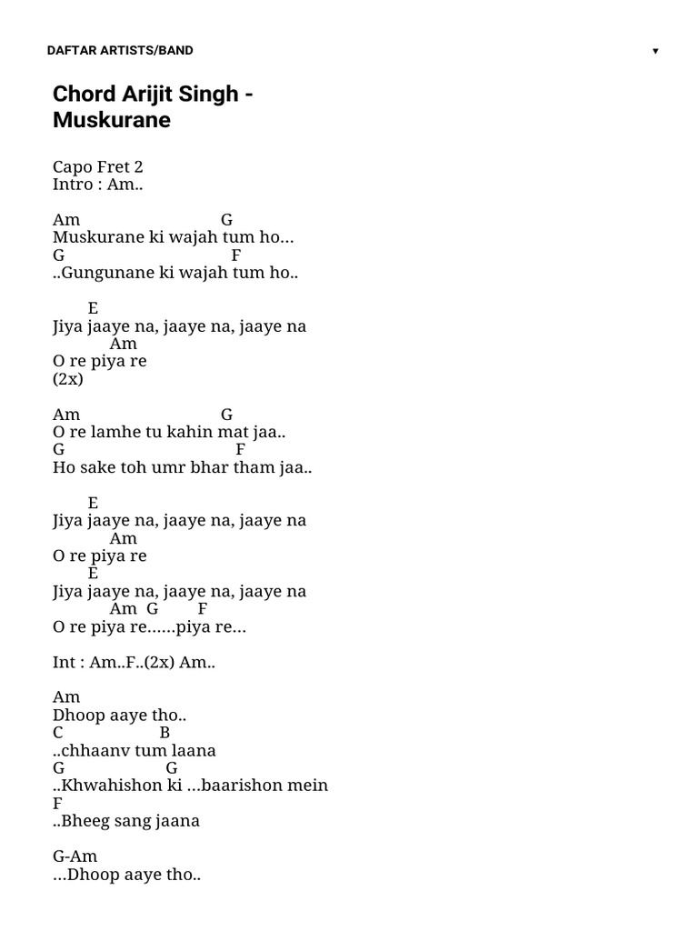 Muskurane Ki Wajah Chords With Capo Song. India Dil Kya Kare Patthar Wargi - Hina Khan Tanmay Ssingh B Praak Jaani Ranvir. Coming to the chords We have used capo on 2nd fret to make the chords simpler.
