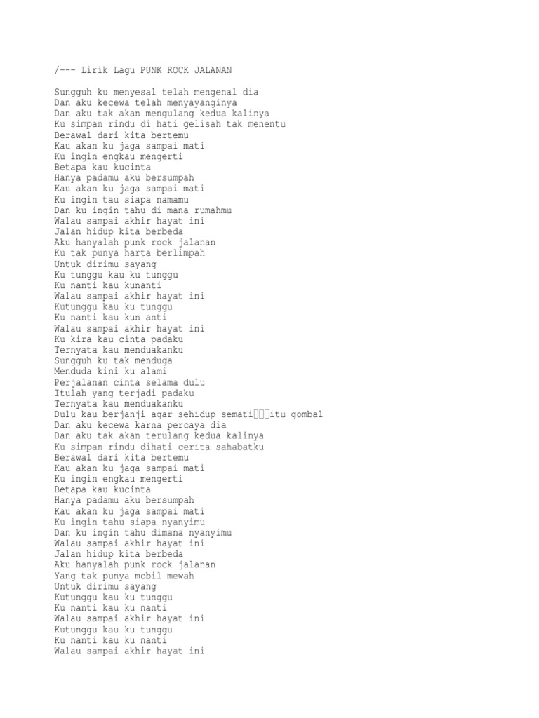 F G Am Am jalan hidup kita berbeda aku hanyalah punk rock jalanan F F G yang tak punya harta berlimpah untuk dirimu sayang. Nella kharisma - Pacarmu Sanjipak. Lirik Lagu dan Chord Gitar Musisi Jalanan - Punk Rock Jalanan Am Em F G C Sungguh ku menyesal telah mengenang dia Am Em F G C Dan aku kecewa telah menyayanginya Am Em F G C Dan aku tak akan terulang kedua kalinya G C G Ku simpan rindu di hati Am Em Gelisah tak menentu F C Berawal dari kita bertemu Dm G Kau akan ku jaga C G Ku ingin engkau mengerti Am Em Betapa kau ku cinta.